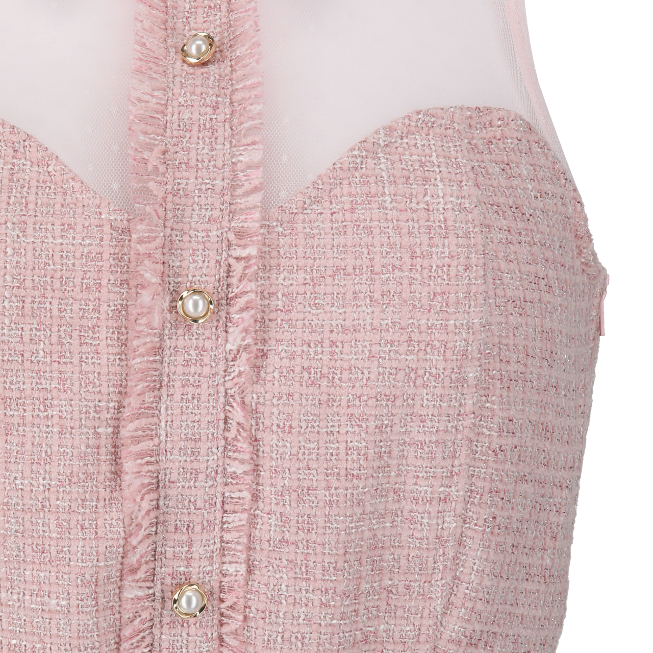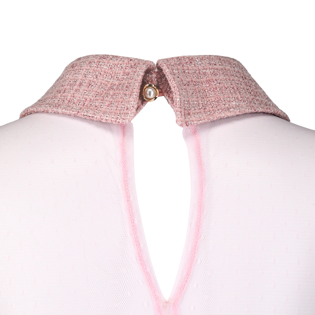 上品なピンクのツイード生地を使用したエレガントなデザイン。