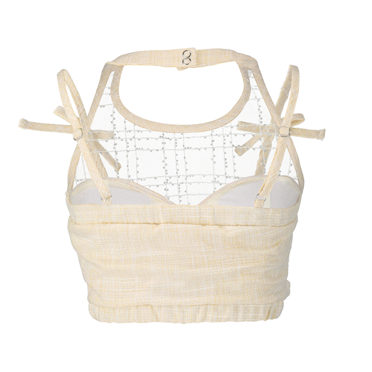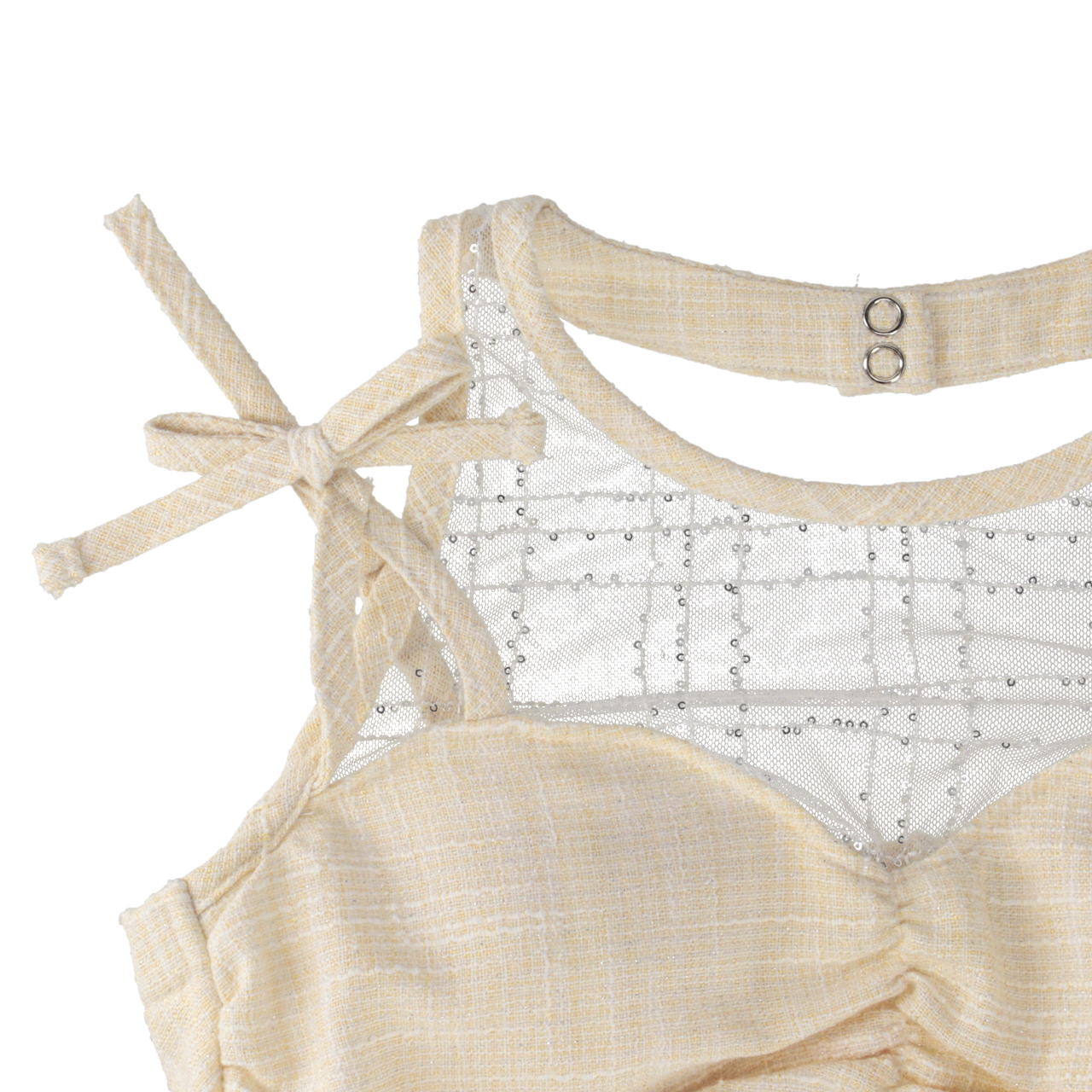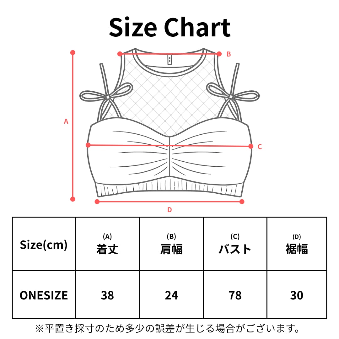 トップスはリボン付きショルダーストラップが安定感をもたらし、胸元のギャザー加工が立体感を演出。