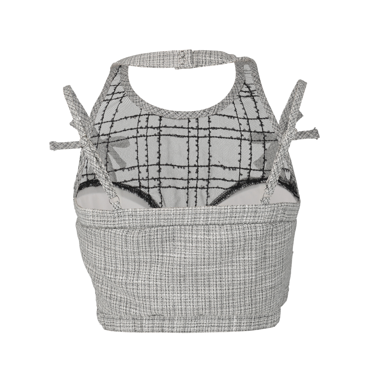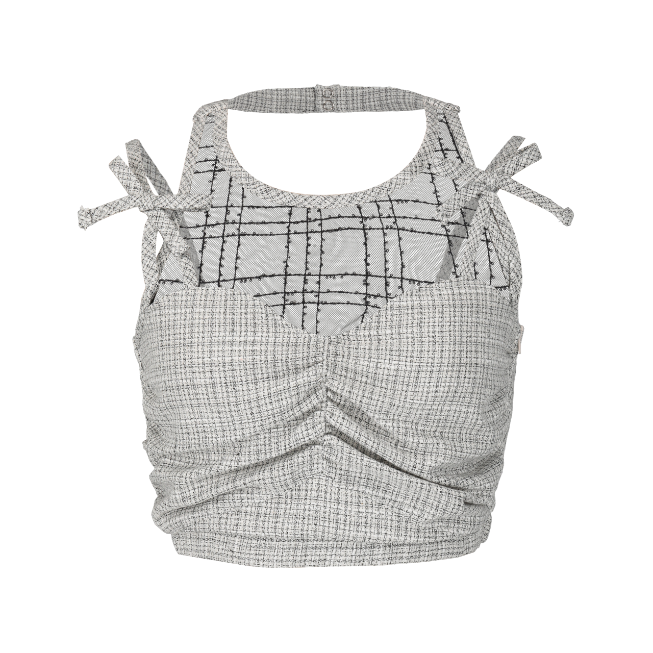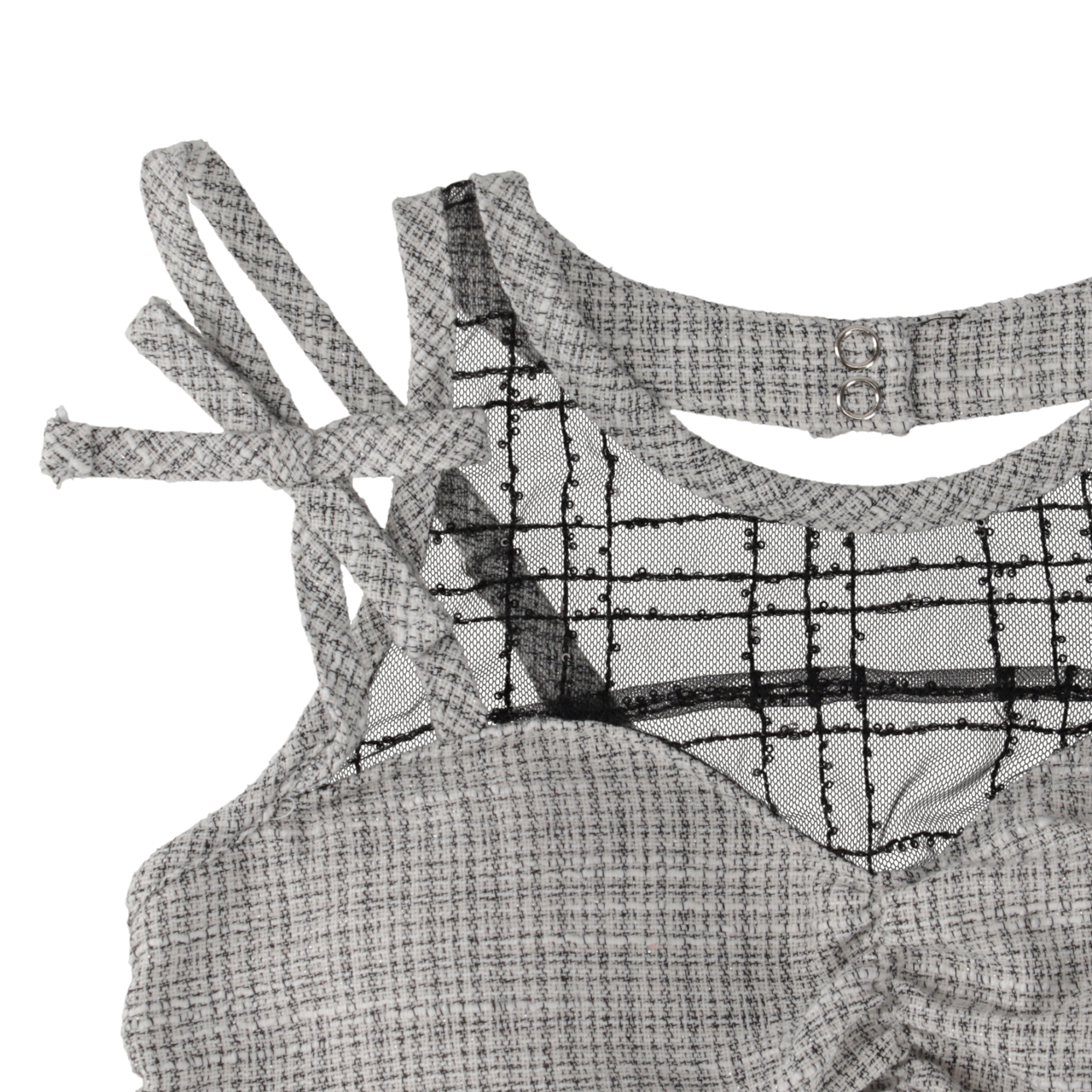 トップスはリボン付きショルダーストラップで安定感を保ち、胸元のギャザー加工が立体感を演出。