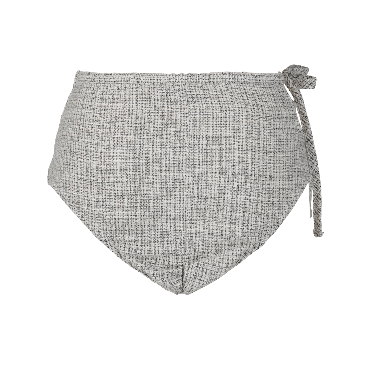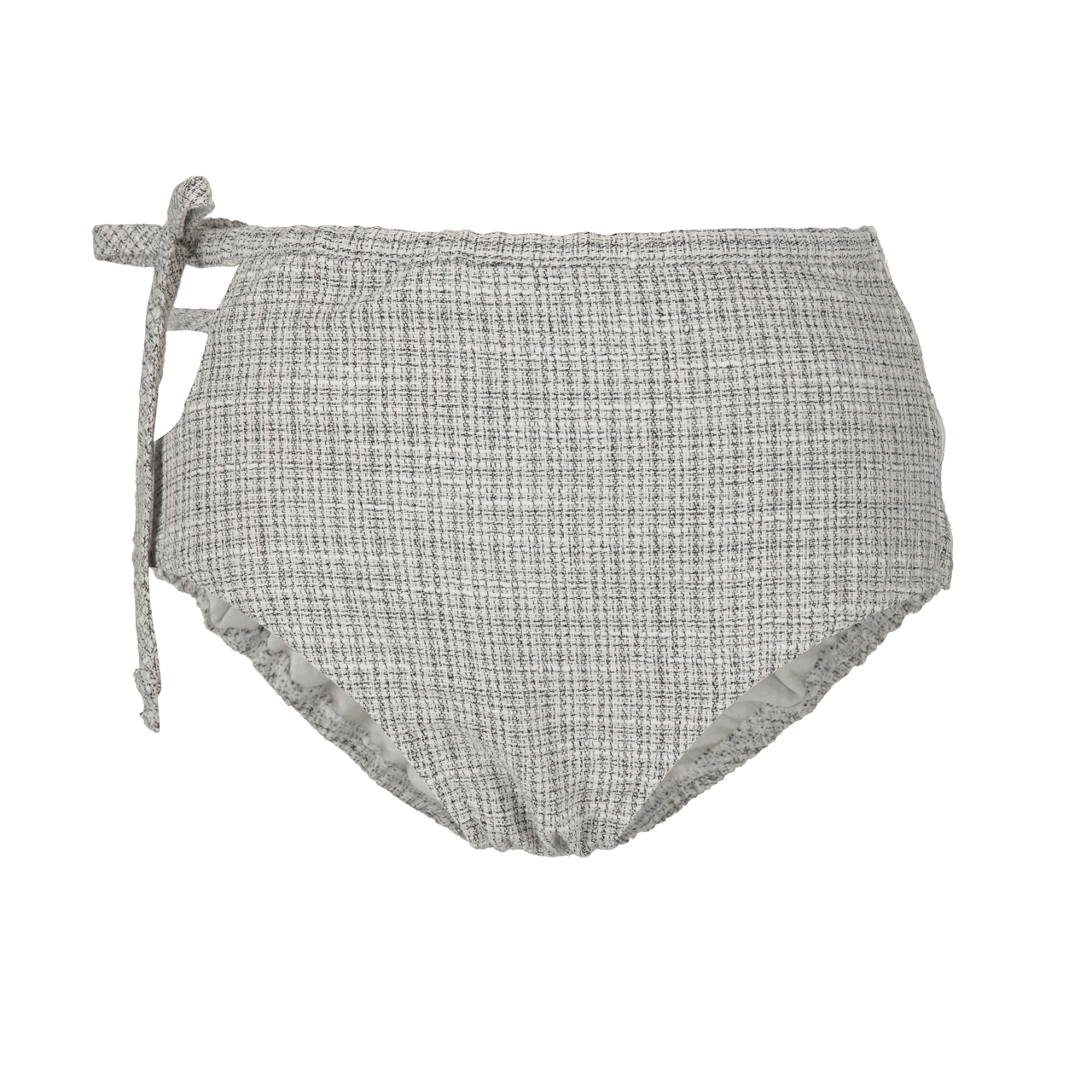 ボトムスはサイドにリボンモチーフを施し、片サイドのカットで抜け感をプラス。