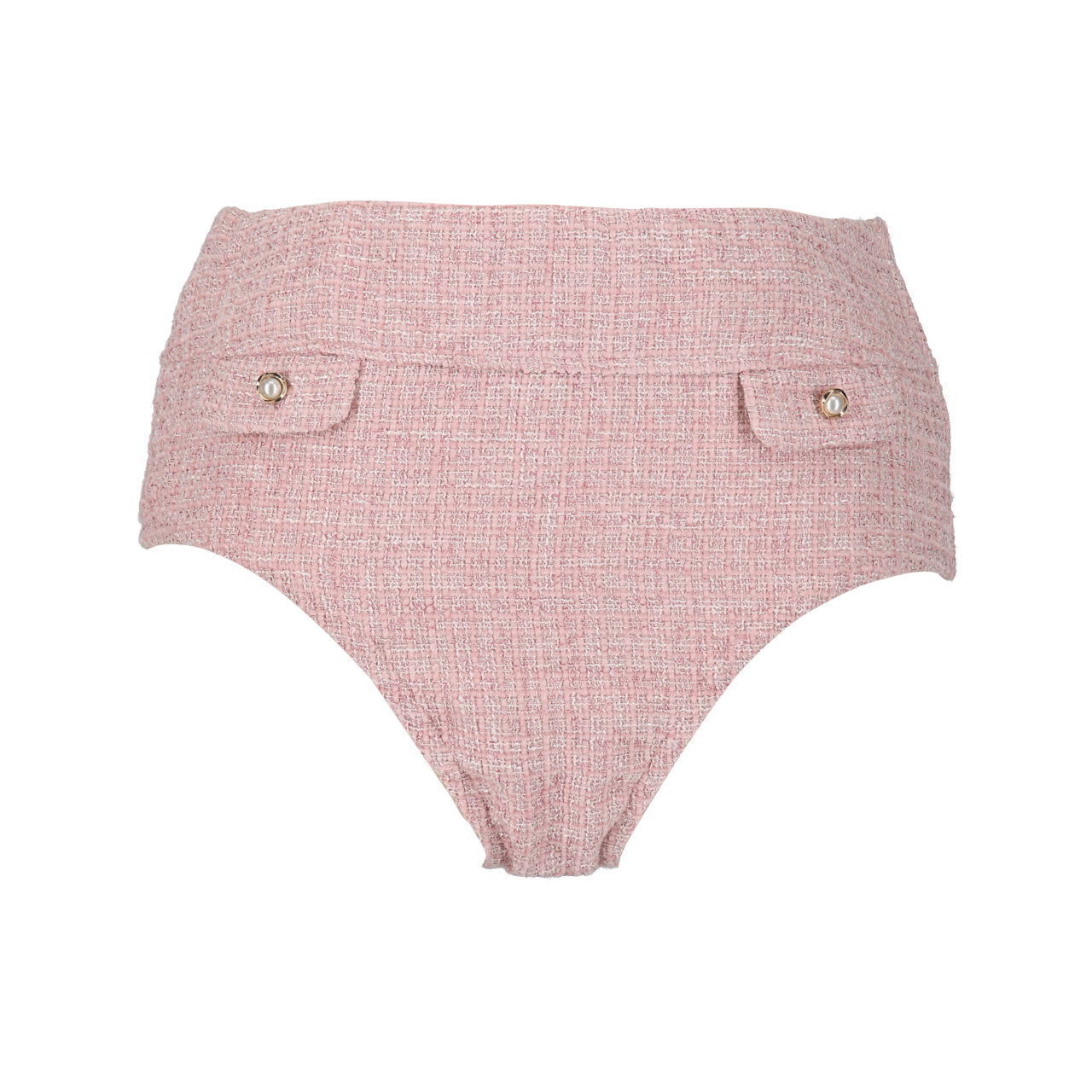 ボトムスはハイウエスト仕様で腰回りをすっきりと見せ、フラップポケット風デザインとパールボタンがアクセントに。