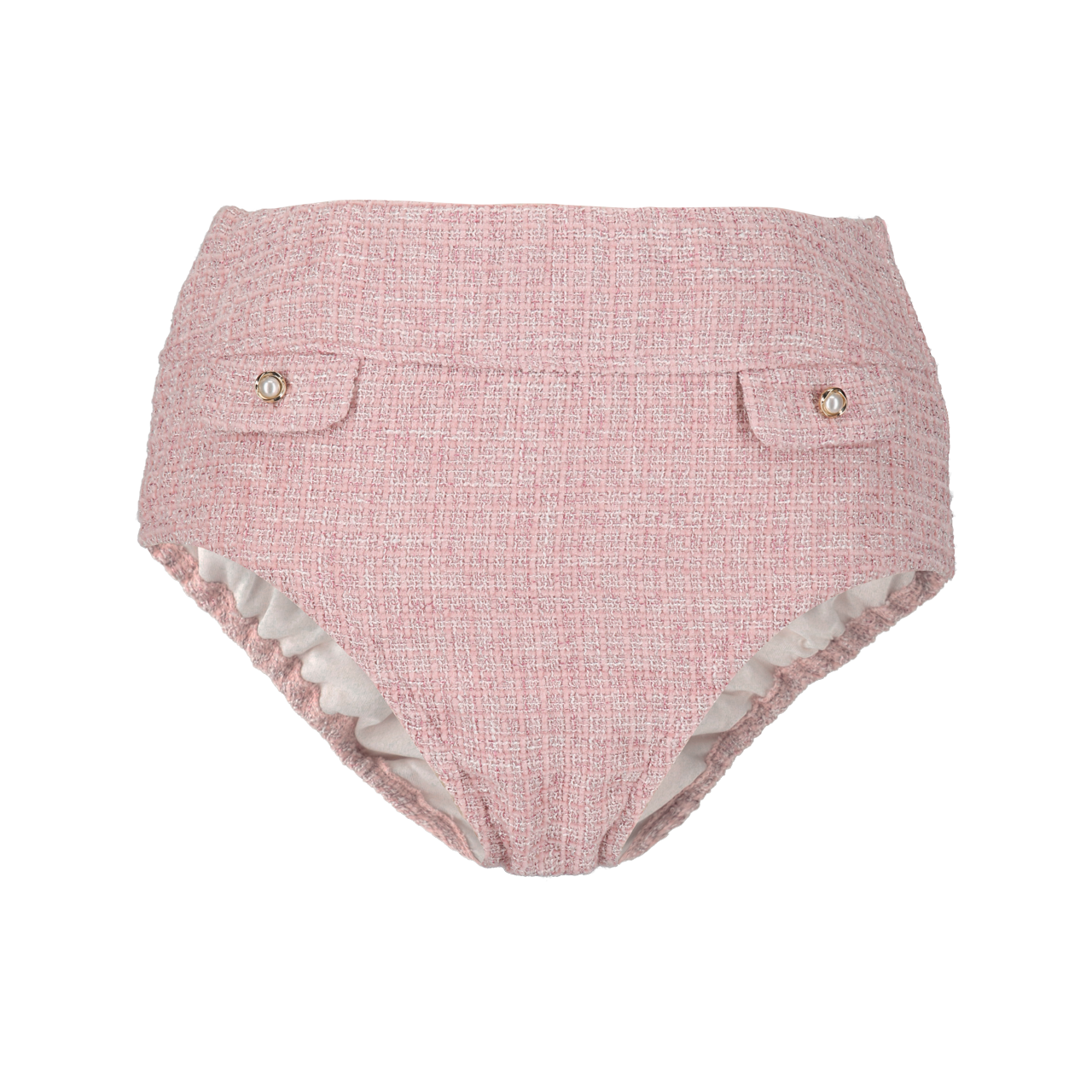 上品なピンクのツイード生地を使用したエレガントなデザイン。